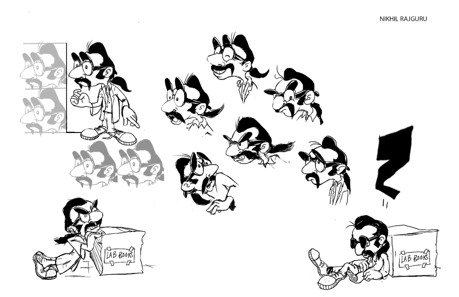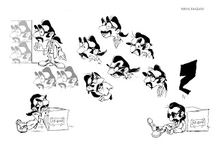When you are satisfied with the character, explore their expressions and develop a chacter model sheet. here's one sheet from an original design of mine: the feedback was that the glasses are probably too difficult to animate, but I liked the fact they had a persona that reflected the character's moods..